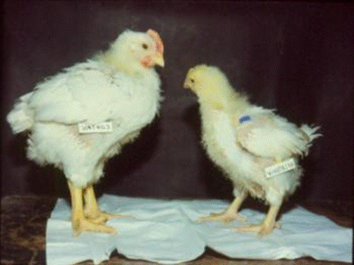 患病雞羽毛粗亂,相對正常雞個體明顯偏小,雞爪蒼白(左側(cè)為對照